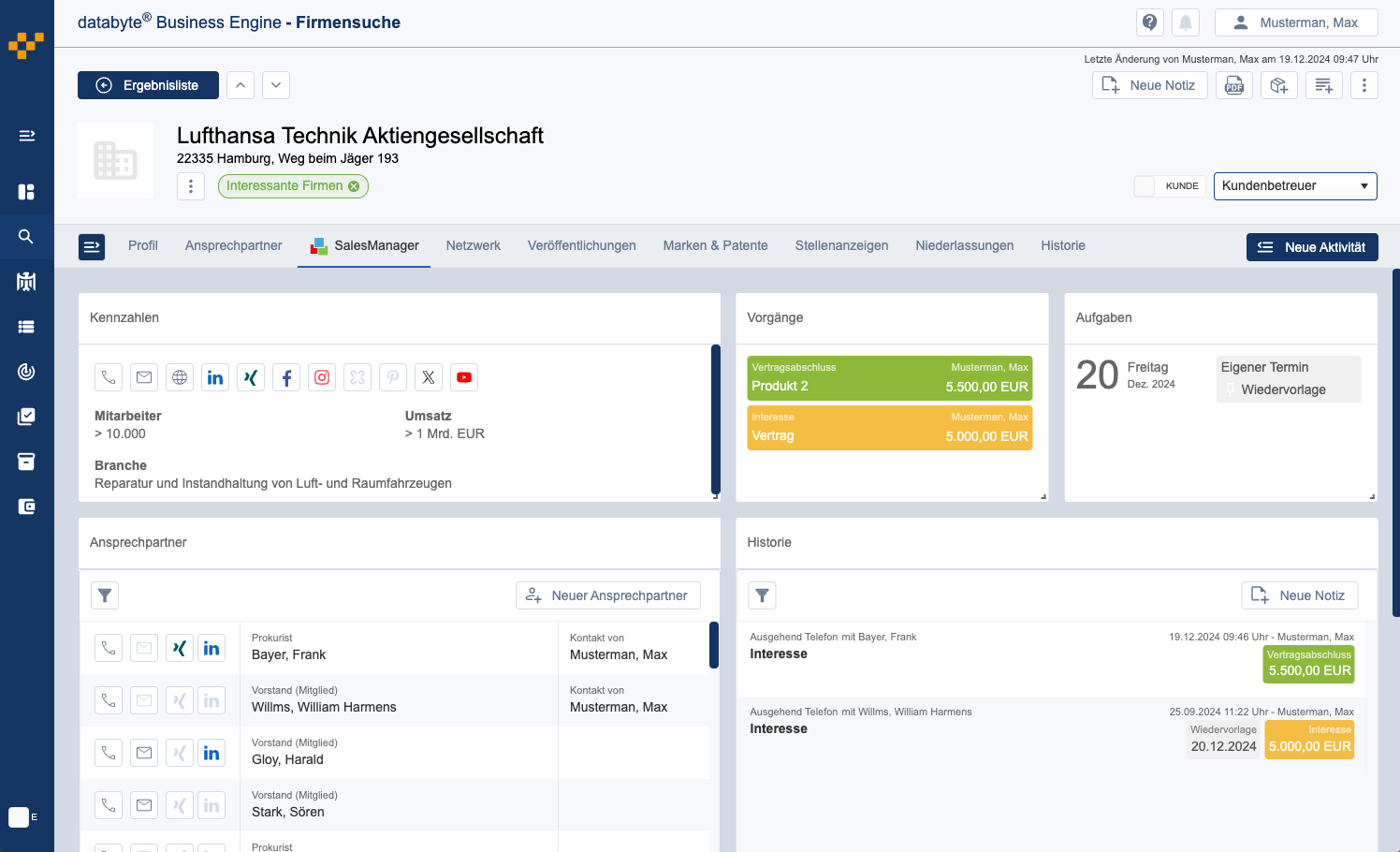 Was bringt ein CRM ohne Daten? Mit dem SalesManager organisieren Sie nicht nur einfach Ihre Leads, Sie bekommen auch direkt Zugriff auf über 10 Millionen Unternehmen mit allen Business-Informationen.